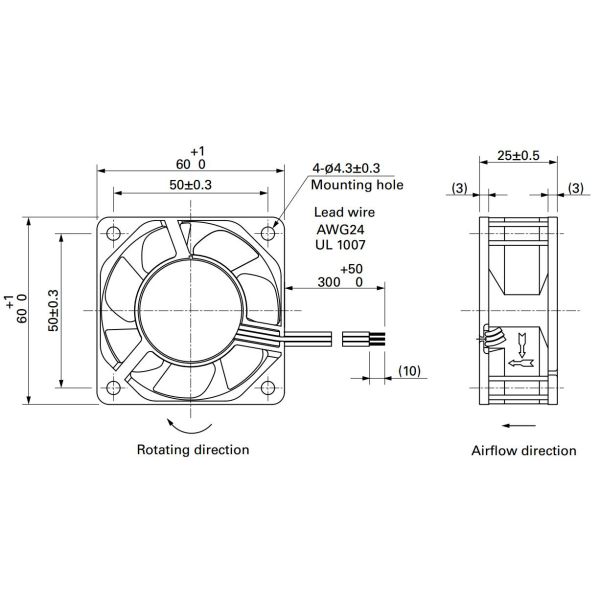 Frame and Impeller: Frame: Plastic (Flammability: UL 94V-0), Impeller: Plastic (Flammability: UL 94V-1)